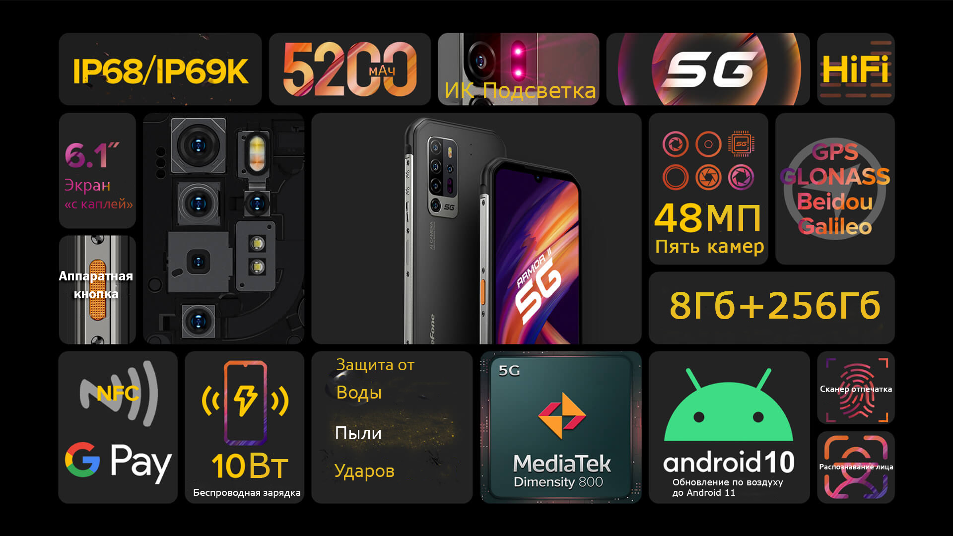 1. 5G сети доступны не во всех странах. Где нет покрытия 5G Ulefone Armor 11 будет работать в 4G/3G/2G сетях, в зависимости от покрытия оператора связи.