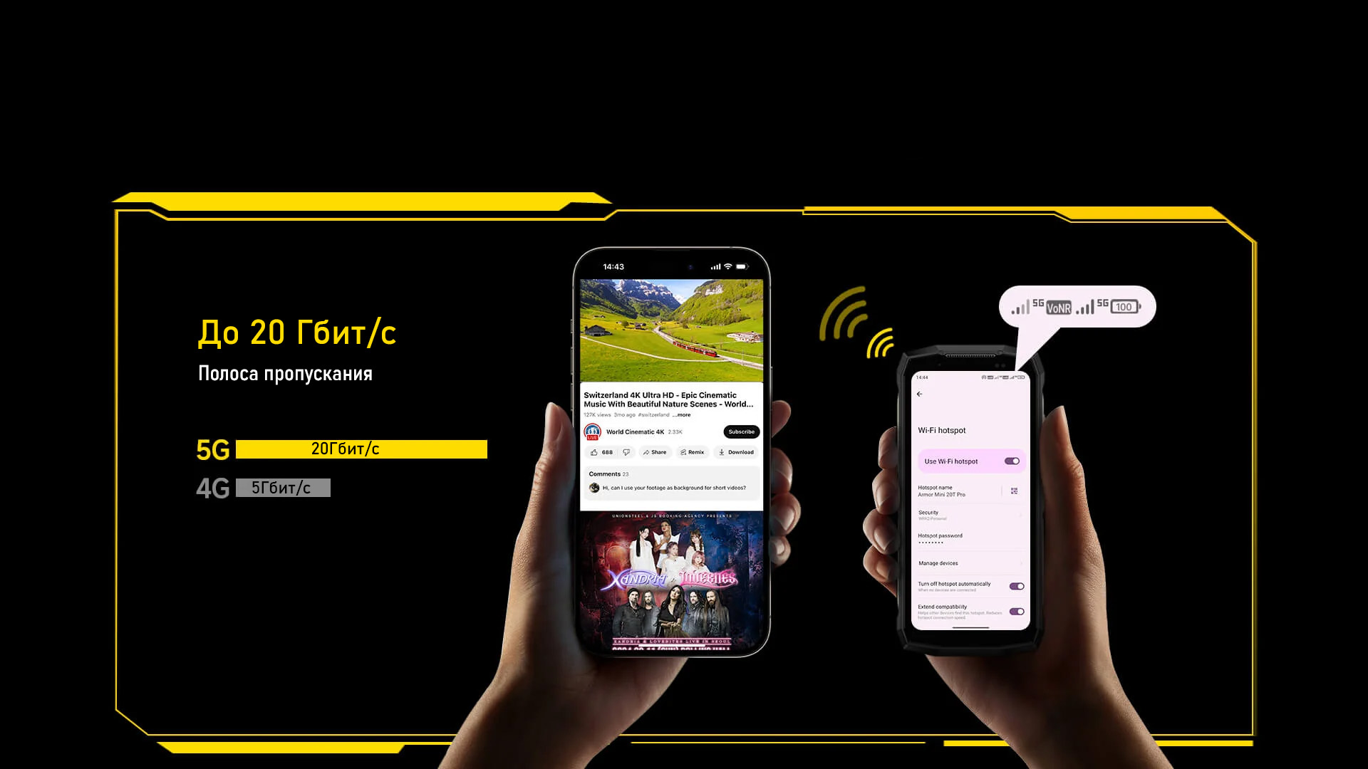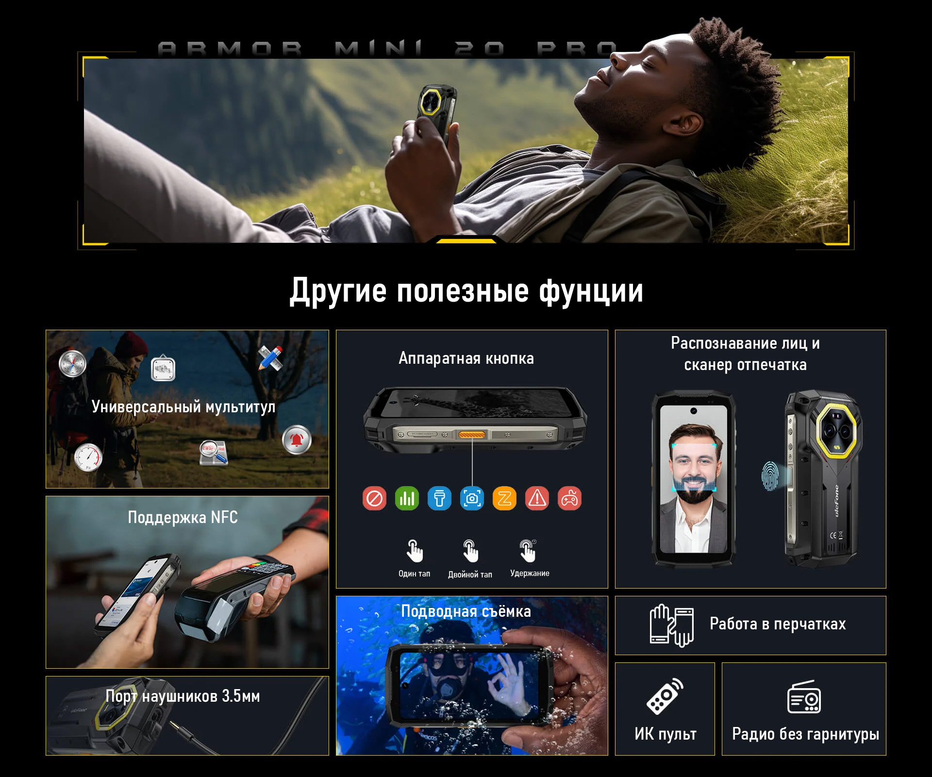 Поддержка расширенных диапазонов 5G, мгновенная скорость загрузки трансляцией, малый отклик и малые энергозатраты. Ulefone Armor Mini 20 Pro может работать в качестве точки доступа Wi-Fi диапазона 5ГГц.